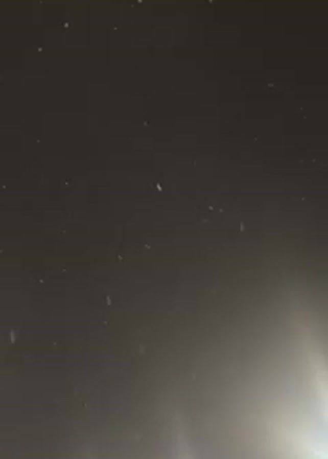 snow falling in the dark. The flakes are sparse but illuminated by a bright light source at the bottom of the frame, which casts a strong glare. The background is generally dark and out of focus.