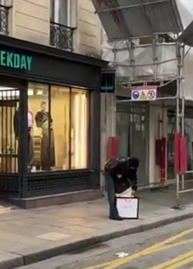 A person in a black jacket, dark pants, and a ski mask stands on a sidewalk in Paris, France. The person is bending down to open a black briefcase on the sidewalk next to a large, white shopping bag with black handles. The person looks up and stands up straight, holding the bag in one hand and the briefcase in the other. The person is standing near a "WEEKDAY" retail store with a large glass window. To the right of the person, scaffolding covers the facade of the building. The sidewalk is adjacent to a street with yellow lane dividers.