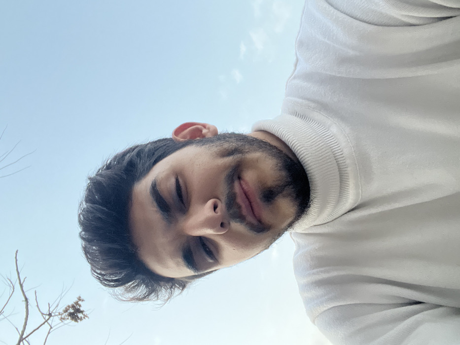 A low-angle selfie captures a young adult male looking towards the camera with a slight smile, revealing dimples on both cheeks