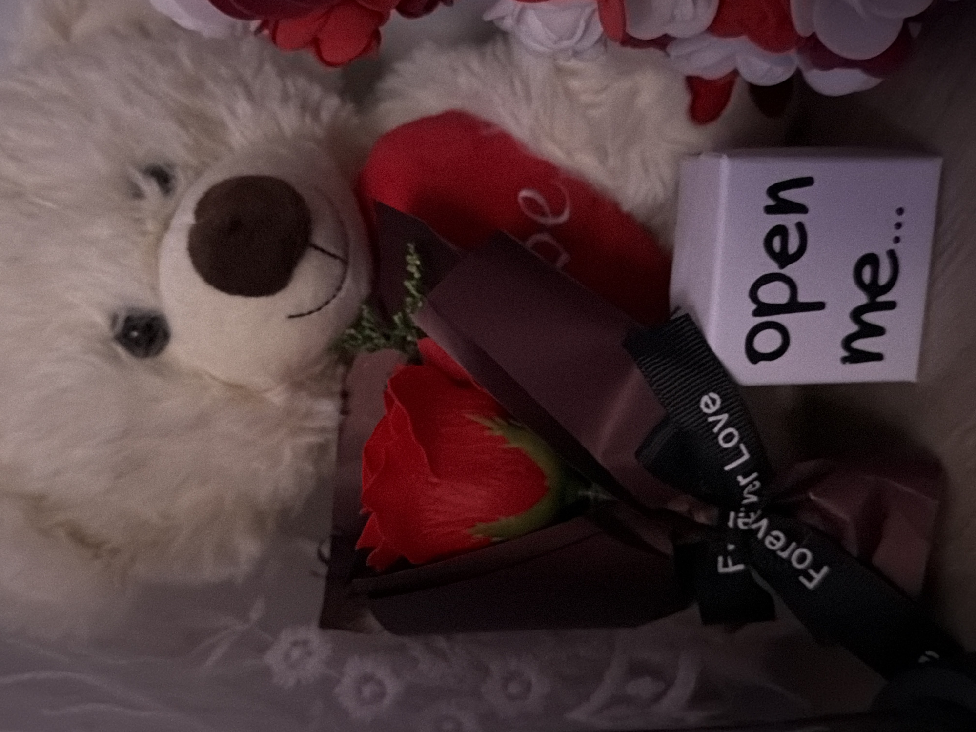 The image presents a dimly lit indoor still life featuring three primary objects arranged on an unidentifiable surface. In the upper-center and right, a cream-colored plush teddy bear is visible, facing forward. It has dark, round eyes, a dark brown snout, and a stitched smile. A red heart-shaped fabric item, possibly a small pillow or appliqué, rests against its chest, partially obscured by another object, with white embroidered letters "se" visible on its surface. A single red artificial rose is positioned in the lower-left to central area, wrapped in dark brown paper or fabric, with its green sepals visible at the base of the bloom. A black ribbon is tied around the rose's wrapping, displaying white text that reads "Forever Love". This wrapped rose leans against the teddy bear. In the lower-right foreground, a small white cuboid box is placed. It has black handwritten text on its visible face that states "open me...". The background to the left shows a light-colored, patterned material, possibly a sheer curtain or wall covering with a floral motif. To the right of the teddy bear, out-of-focus red and white ruffled or floral decorative elements are present. The specific location within the city of Varna, Bulgaria, or any other geographical area, cannot be determined from the visual information provided in the image.