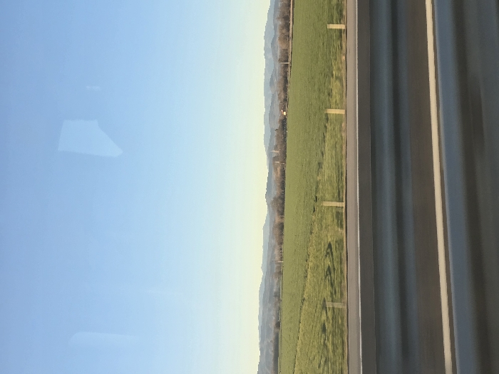 The image depicts a rural landscape near Загорци, Bulgaria, observed from a vehicle on a paved multi-lane road. The lower third of the frame shows the road, characterized by dark gray asphalt and distinct white lane markings. Above the road, a green agricultural field stretches horizontally, bordered by a fence line consisting of irregularly spaced light-colored wooden posts. Faint dark markings, possibly tire tracks, are visible on the field's surface. Beyond the field, a line of dormant trees and sparse vegetation extends, with several indistinct structures, possibly industrial or residential, visible on the distant horizon. A range of hazy, bluish-gray mountains forms the furthest background. The upper two-thirds of the image features a clear, light blue sky, transitioning to a pale yellow hue near the horizon. Two distinct, light-toned, angular reflections, consistent with internal vehicle reflections, are present in the upper left and right portions of the sky. No individuals or specific actions are discernible.
