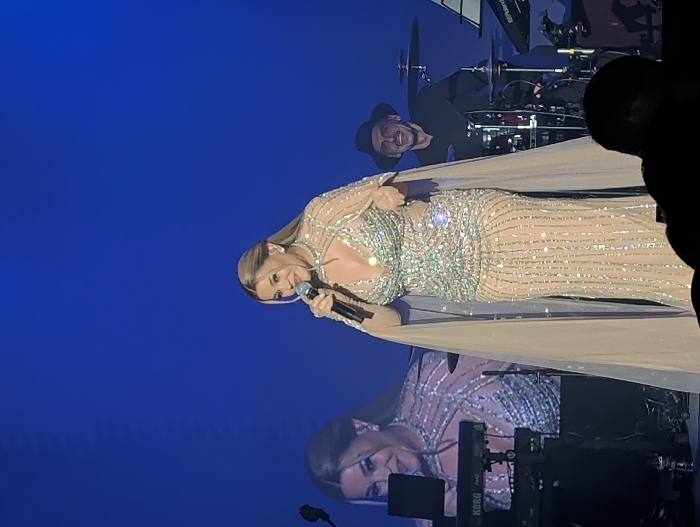 A live musical performance is depicted on a stage in Sofia, Bulgaria. The central figure is a female vocalist with blonde hair, styled in a ponytail, wearing a long, form-fitting, beige-colored gown heavily embellished with reflective sequins or crystals. The gown features a deep V-neckline and sheer, floor-length capes extending from the shoulders. She holds a black microphone in her right hand, positioned near her mouth, and exhibits a slight smile. The stage is illuminated by bright overhead lighting against a solid royal blue backdrop, possibly an LED screen. To the left of the vocalist, a large screen displays a close-up image of her, also smiling. Below this screen, a black Korg Pa4X keyboard and additional professional audio equipment are visible. To the right, partially obscured by the vocalist's dress, a male drummer wearing a dark fedora-style hat and a dark shirt is seated behind a drum kit, including cymbals and a Roland electronic drum pad. He is smiling broadly. The lower foreground shows the dark, silhouetted heads of several audience members, indicating the photograph was taken from the crowd's perspective.