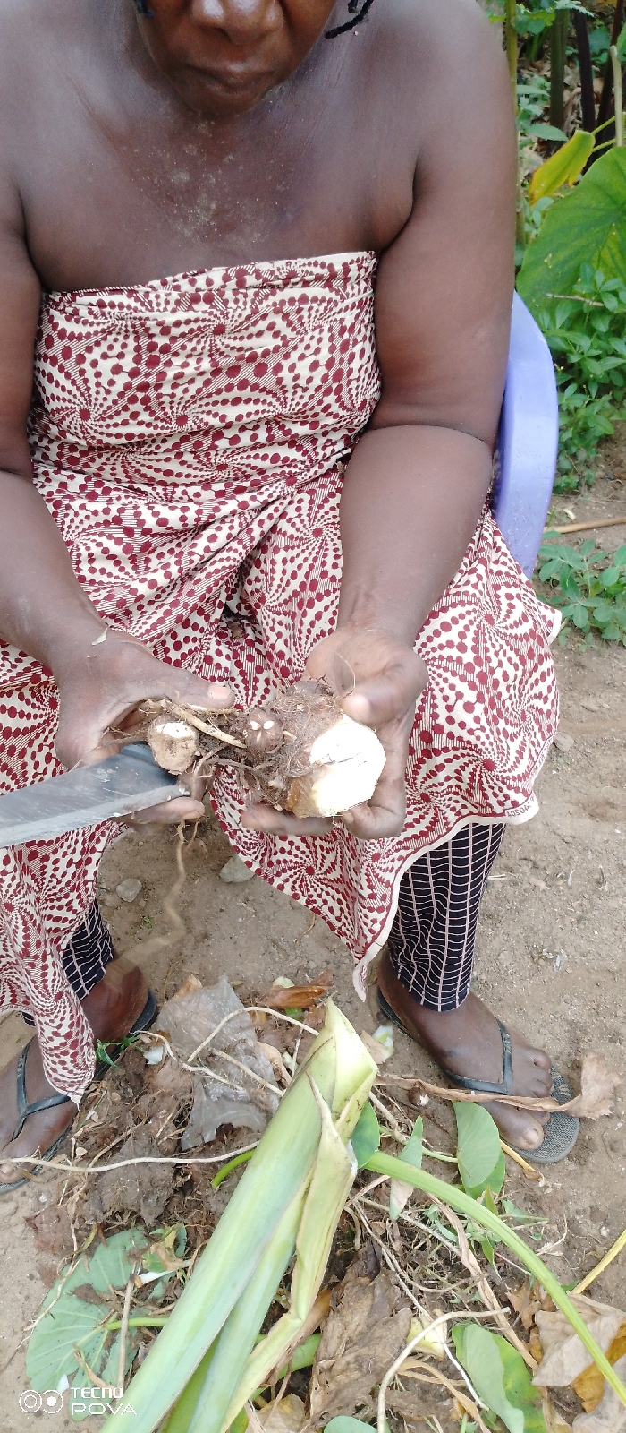 A dark-skinned person sits outside, holding a cut root vegetable with a machete. She's wearing a patterned cloth wrapped around her torso and black and white checked pants. A pile of plant debris, including broad green leaves and stalks, lies at her feet. The person is seated on a blue chair. The ground is dirt, and there are green plants visible in the background. The brand 'TECNO POVA' is stamped at the bottom left corner.
