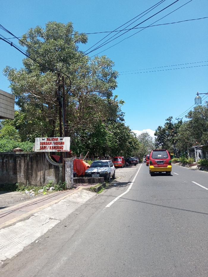This image depicts an outdoor street scene under a clear blue sky on a bright day, purportedly in the city of Tagtse Tashidingkha, Bhutan. However, a prominent sign on the left contains Indonesian/Malay text, specifically "JUAL HEWAN QURBAN / AQIQAH SAPI / KAMBING" (meaning "SELL SACRIFICIAL ANIMALS / AQIQAH COWS / GOATS"), indicating the actual location is likely in a Southeast Asian country where this language is spoken. The scene is viewed from a slightly elevated perspective beside an asphalt road. Overhead, multiple black power lines crisscross the upper frame. On the left, a large, dense green tree dominates, partially obscuring the sky. Below it, a dark utility pole stands. A low, stained concrete wall runs along the roadside, behind which an orange tarp is visible. Attached to a smaller pole in front of this wall is the aforementioned white sign with red lettering. A white sedan, license plate B 8524 UM, is parked on the unpaved shoulder near the wall, followed by other parked vehicles, including a red minivan. The road itself is marked with a white solid line on the immediate right and a broken white line further ahead. A red and yellow minivan is observed driving away from the viewer in the right lane. On the right side of the street, more trees and hints of structures line the road, with a distinctive streetlight fixture visible further down. No people are visible.
