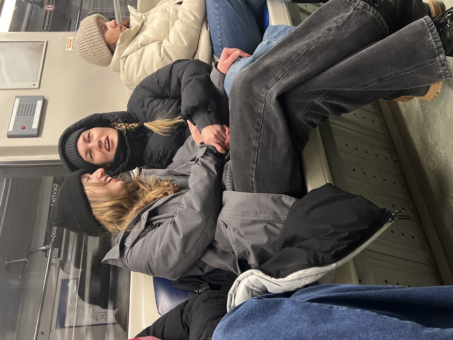 Three women sit together on a train. One woman in a tan hat and jacket sleeps. Another woman in a black puffer jacket and hood looks at a third woman. The third woman wears a black beanie and a gray jacket and smiles. The women are holding hands. One woman has her legs spread over the seat. The background shows the train car with signs and seats.