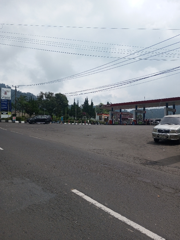 A gas station is visible in the image, with multiple fuel pumps under a red roof structure. A silver SUV is parked to the right of the pumps, while a black SUV is parked further to the left. A signpost is on the far left side of the image. The foreground shows a stretch of asphalt road with a white dividing line. Above the station, a cloudy sky and power lines are evident. Trees and some hills are visible as a backdrop behind the gas station.