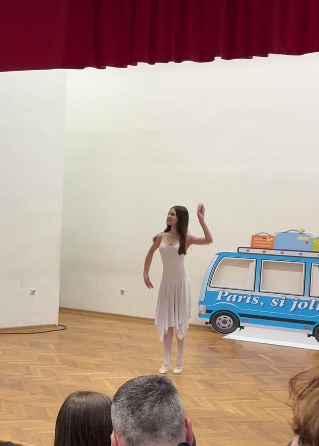 A young woman in a white dress dances on a wooden stage in front of an audience. A blue cutout of a van with luggage on top is visible in the background. The words "Paris, si jolie" are printed on the side of the van. A red curtain hangs above the stage. Several people are visible in the foreground, seated and watching the performance. The woman moves gracefully, extending her arms and turning.