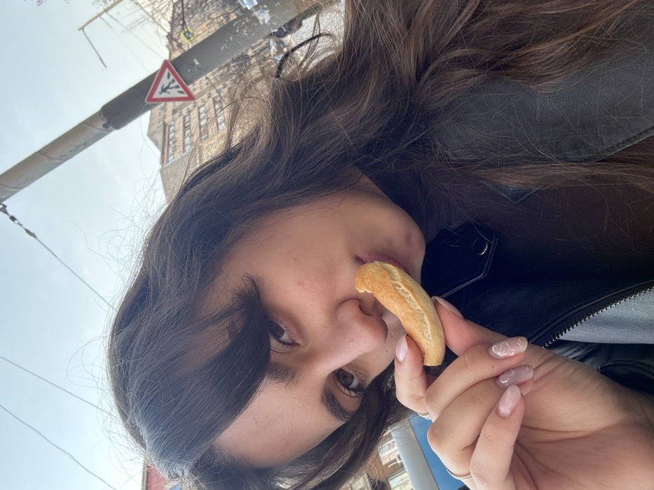 The scene depicts a female individual in a close-up, outdoor setting on an urban street in Sofia, Bulgaria. The subject, with long, dark, wavy hair and bangs, is observed looking directly forward. She wears a black leather jacket. Her left hand, adorned with multiple rings on the fourth and middle fingers and manicured nails featuring a light, translucent polish with white lineal art, holds a small, crescent-shaped, light-brown baked item to her mouth, suggesting consumption. In the background, a clear light blue sky is visible. A gray utility pole stands to the right, bearing a red-bordered white triangular warning sign with a black pedestrian figure. Beyond the pole, multi-story buildings with light-colored facades are visible, including one with distinctive recessed architectural elements. Bare tree branches are present, and faint vehicular traffic is discernible in the distant background, indicating a public thoroughfare.