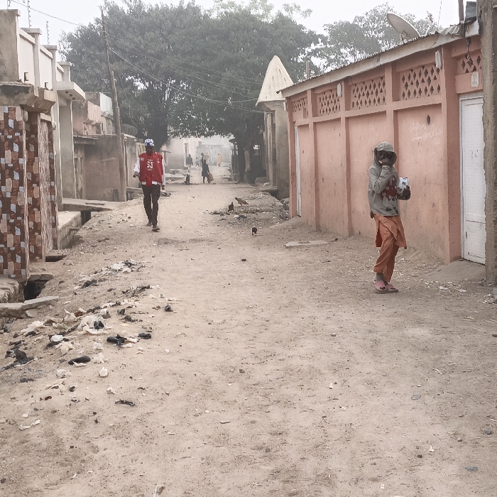 The image portrays an unpaved, dusty residential street in Kaura Goje, Nigeria, under a hazy sky