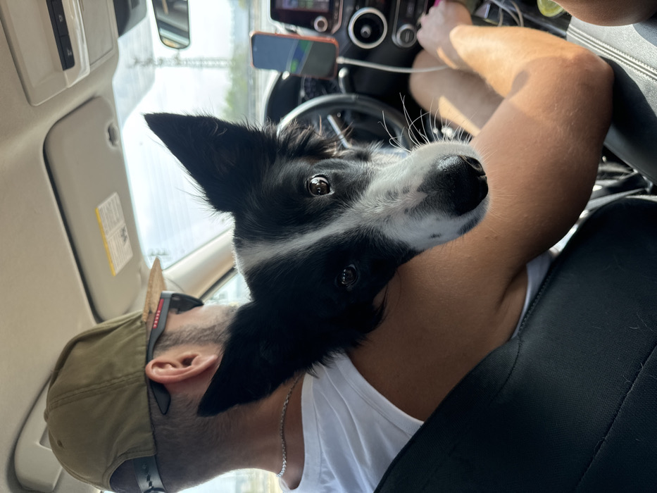 The image depicts the interior of a vehicle within the Galil Elyon Regional Council, Israel. A male driver, visible from behind his right shoulder, wears a backward khaki baseball cap, black sunglasses (with visible Prada branding on the temple), a white sleeveless shirt, and a silver chain necklace. His right arm rests on an armrest or console, with his right hand positioned near the vehicle's central controls. A black and white dog, identified as a Border Collie or similar breed, rests its head on the driver's right shoulder and upper arm, directly facing the camera with brown eyes and a black nose. The dog's ears are erect. The vehicle's interior features a black driver's seat, a white headliner, and a dashboard with a steering wheel partially visible in the background. A mobile phone with an orange-colored case is mounted on the dashboard, displaying what appears to be a navigation application with green and blue elements, and is connected by a white charging cable. The exterior environment, blurred through the windshield, shows a road with power lines and green foliage under an overcast sky. The driver's lower right leg is also visible.