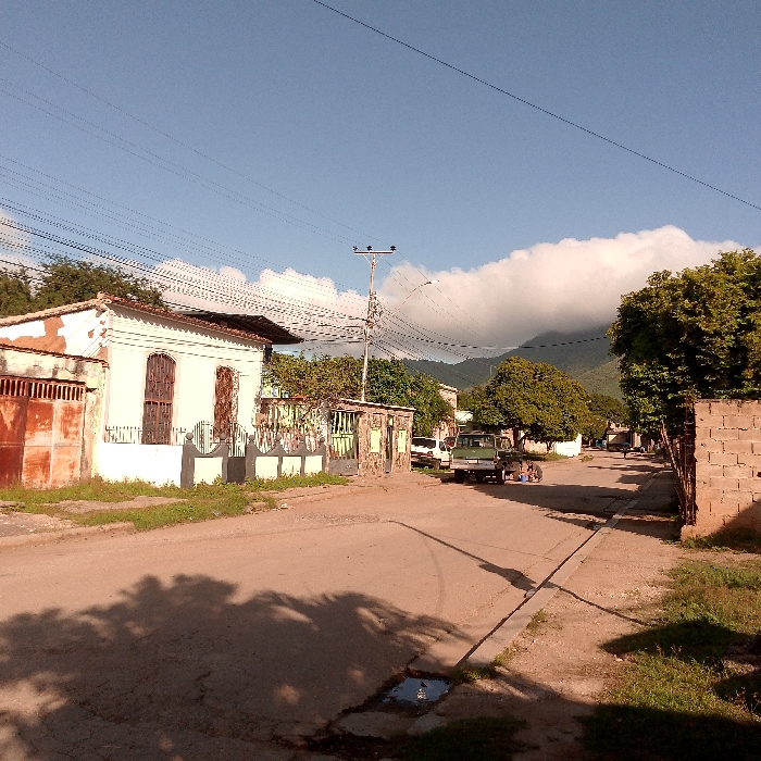 A sunlit street scene features a white building with red trim on the left, adjacent to a faded orange gate. A weathered shack sits near a utility pole further down the street. An old green truck is parked beside lush trees that line the road. In the background, mountains are partially obscured by a large, puffy white cloud. The pavement shows signs of wear, and shadows are cast across the scene.