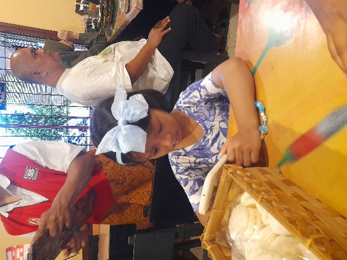 A young girl with a blue bow in her hair sits at a table, reaching into a wicker basket filled with round, white snacks. Her blue and white shirt complements the bracelet on her wrist. Around the table, an older man in a white shirt and a person in a red vest are visible. The table is brightly colored, and the background includes a window with a view to the outside.