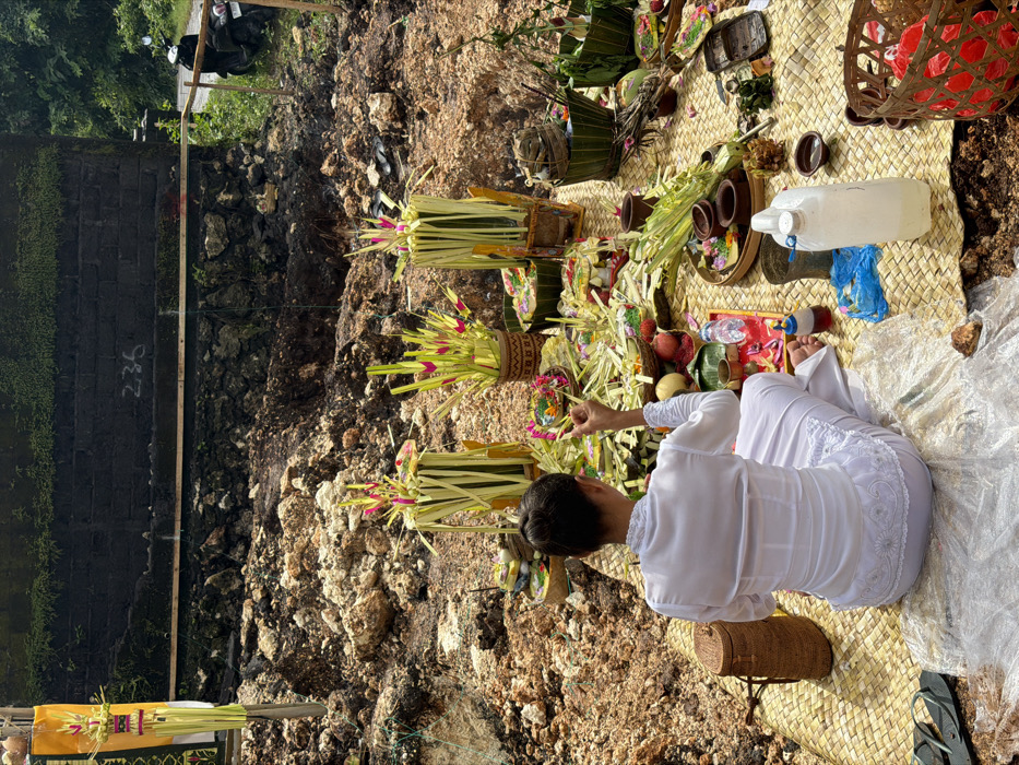 - "A person in white clothing sits on a woven mat next to offerings of fruit, palm leaves, flowers, and containers of water" by FM-ytW0x1, licensed under CC BY 4.0