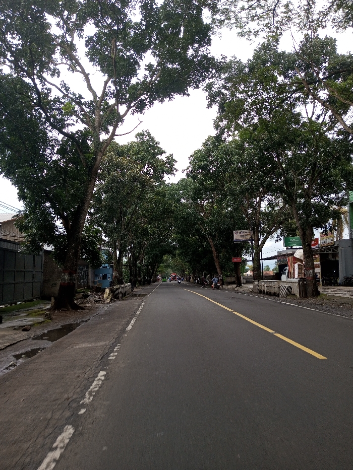 A long, paved road stretches into the distance, marked with a single yellow line. Tall trees line both sides, their branches forming a canopy overhead. Buildings and shops are visible on the right, including signage and a few parked vehicles. People are seated by the roadside. The left side features a wall and some debris. The sky is overcast.