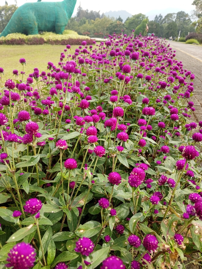 A field of vibrant purple globe amaranth flowers stretches towards a paved road. Their round heads and green leaves fill the foreground. In the distance, a large, green dinosaur statue sits atop a manicured hill. Trees and other greenery complete the backdrop under an overcast sky.