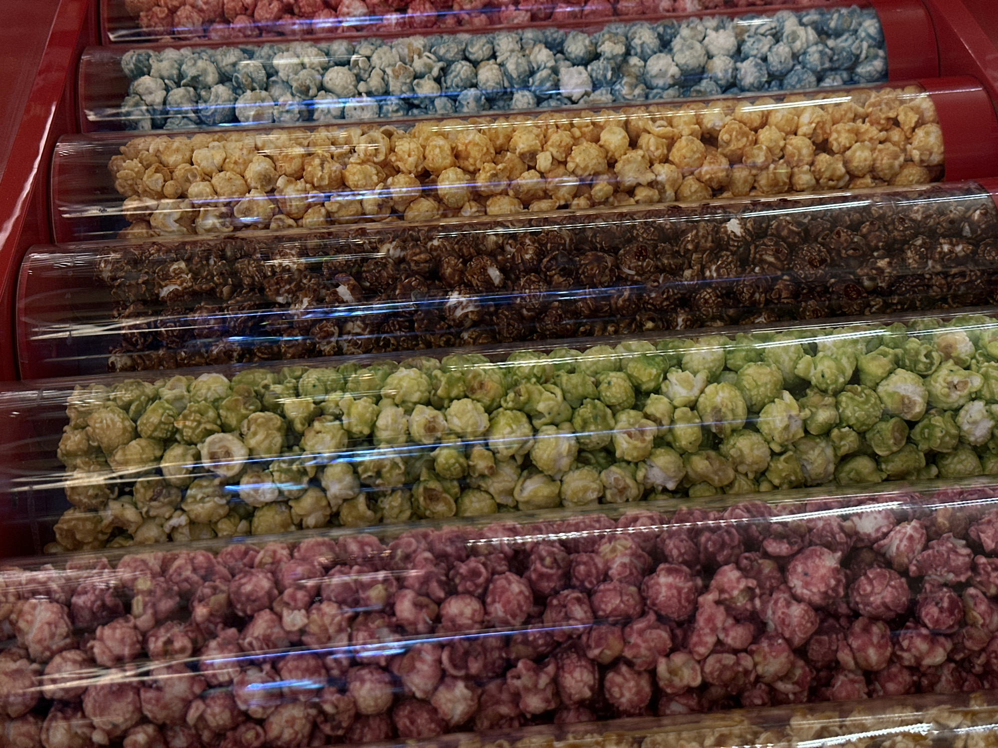 several rows of clear cylindrical containers filled with different colors and flavors of popcorn
