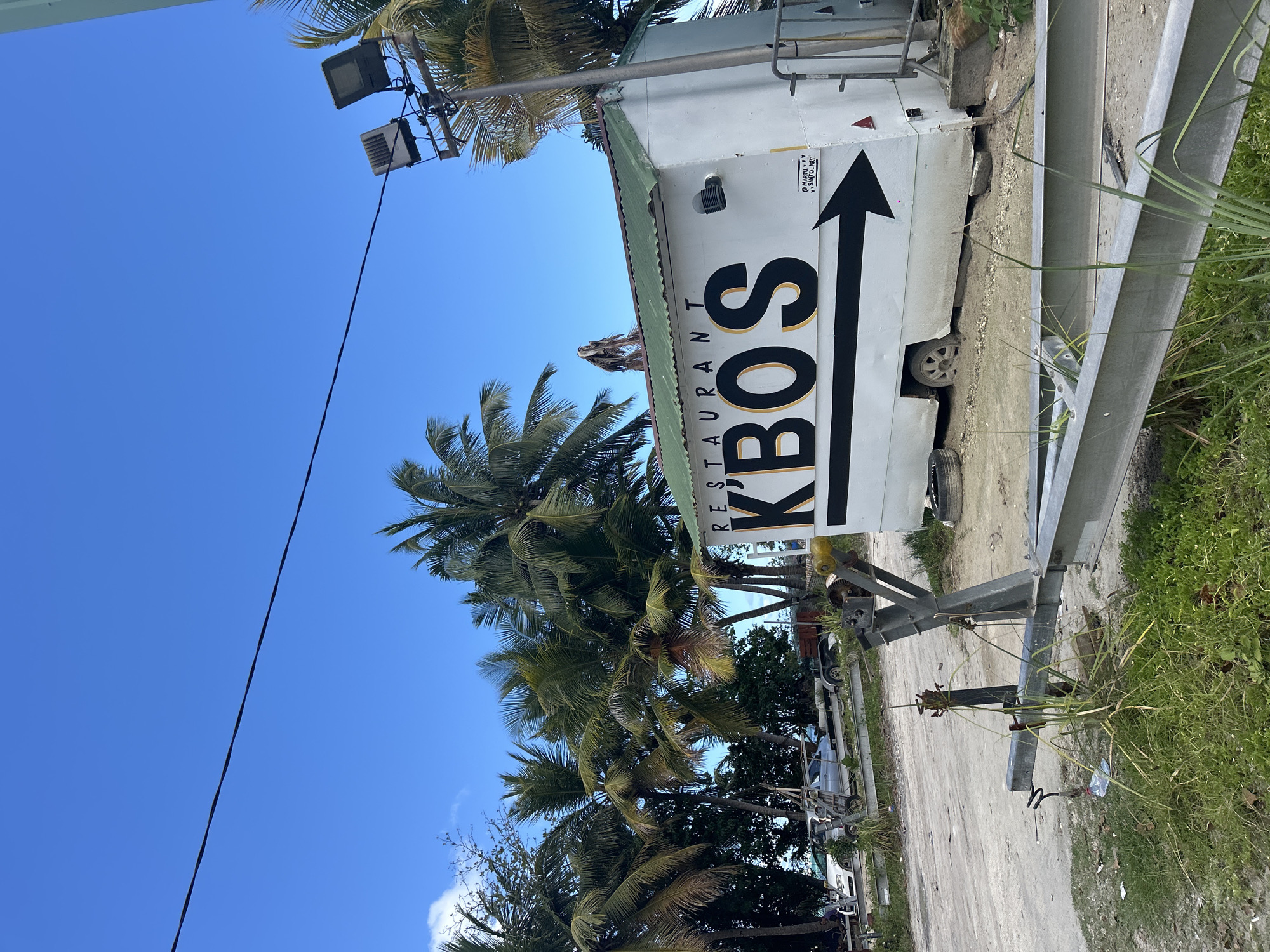 A daytime shot shows a white food trailer with the words "RESTAURANT KBOS" and a large black arrow pointing upwards