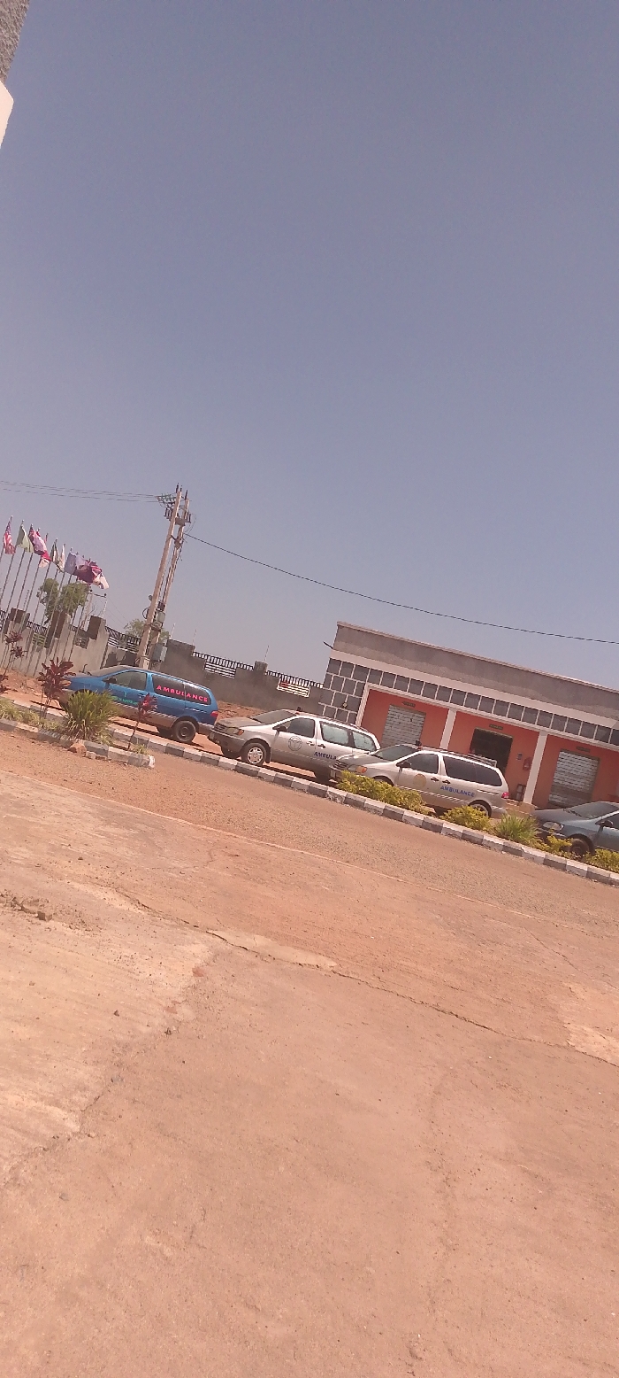 The scene depicts an outdoor parking area or roadside in Jos, Nigeria, under a clear, light blue sky