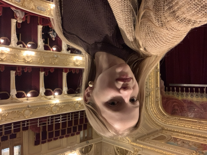 fair-skinned woman with blonde hair, wearing a brown shirt and tan sweater, in a theatrical setting. Behind her is an ornate theater interior with multiple levels of balconies adorned with gold trim and red velvet curtains. The seating areas appear to be elevated, with visible rows of seats and architectural details. The image appears to be rotated counter-clockwise.