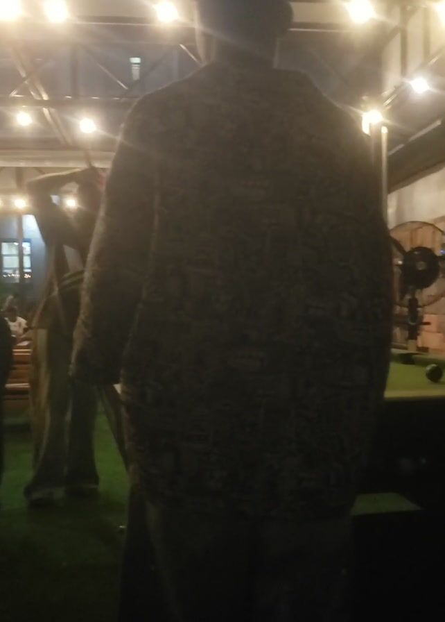 The video depicts an indoor scene with low lighting, likely at night. A person wearing a patterned shirt and dark pants is the main subject, but their features are obscured due to the lighting. Other people are visible in the background, some seated at tables. The indoor space is illuminated by string lights hanging overhead. A pool table is visible, and a television screen is playing content. The camera movement is unsteady, creating a blurry effect at times. The overall atmosphere suggests a casual, social setting.