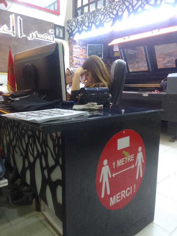 This image depicts an interior commercial space, likely an office or print shop, in the city of Unknown, Unknown. In the foreground, a black desk with a glossy surface features a red circular sign affixed to its front panel, displaying white graphics of two figures separated by a double-headed arrow, labeled "1 METRE" and "MERCI!". On the desk, a stack of magazines is visible, along with a black, textured handbag. To the right of the desk, a female with long, light brown hair is seated, resting her chin on her left hand while appearing to gaze downwards, presumably at a computer screen that is not visible. A black computer monitor (rear view) stands on the desk to her left. Behind this monitor, a second female is partially visible, wearing a light-colored hijab and glasses, also seated and seemingly engaged with a screen or task. To the left of the monitor, a small Moroccan flag is positioned on a stand. The background walls feature white Arabic script ("تجهيزات المكتب" - Office Equipment) on a dark surface, a decorative light-colored panel with dark tree-like silhouette patterns, and a section of brown brick-patterned wallpaper. Large industrial machinery, possibly a wide-format printer, is located in the background. The area is illuminated by artificial lighting, including a prominent strip light emitting an orange glow. Both individuals are observed in a state of engagement with their respective workstations.