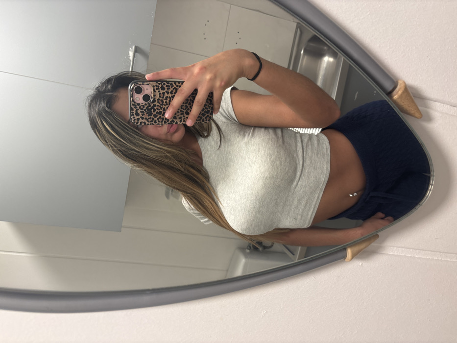 The image depicts a mirror selfie of a female individual, captured from the chest to just below the waist