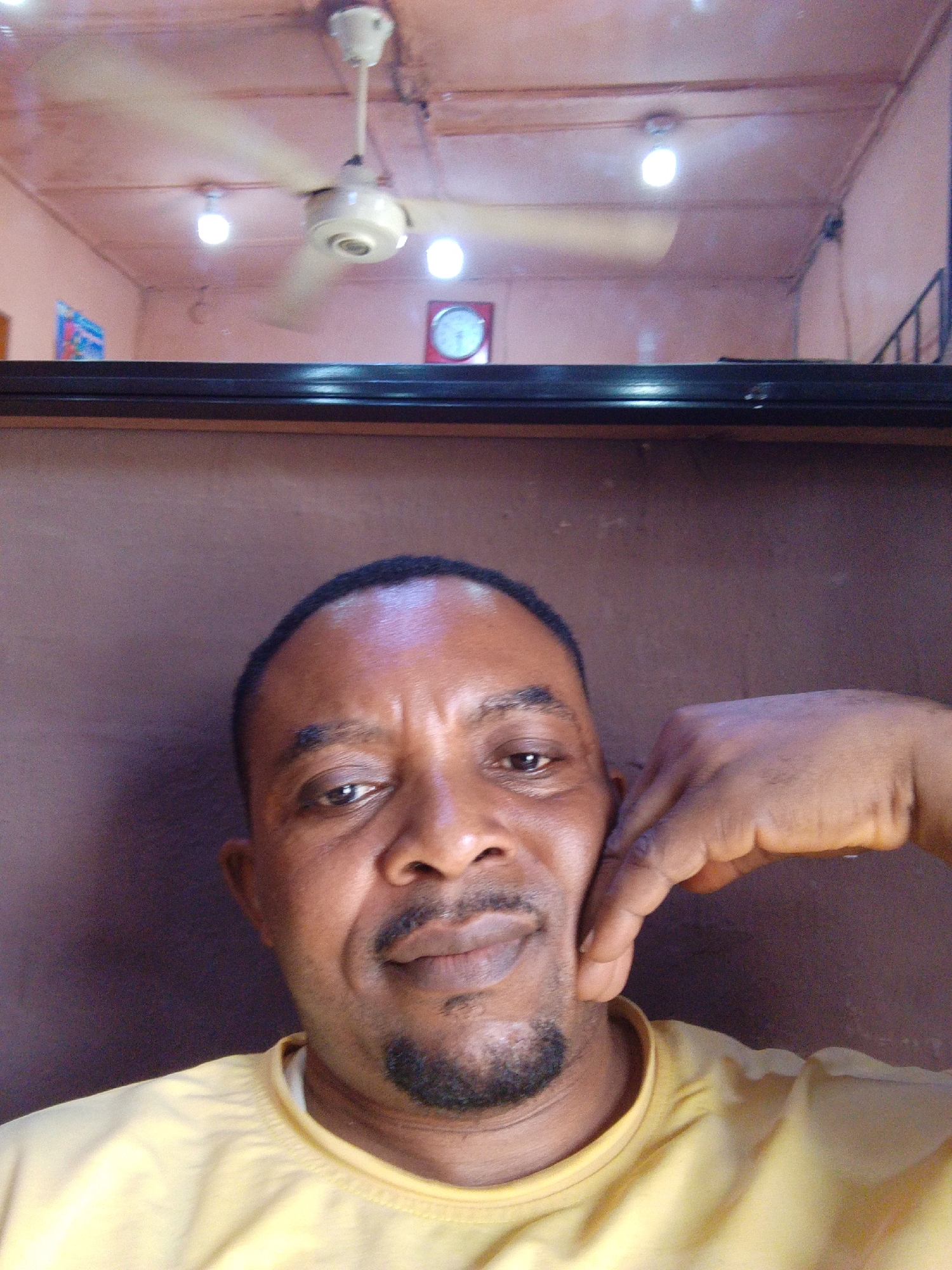 A medium-shot selfie of a dark-skinned man with short black hair and a goatee. He is wearing a yellow t-shirt and resting his hand on his cheek. Behind the man is a dark brown wall with a black horizontal trim along the top. Above the trim is a view into another room with a low ceiling, painted in shades of pink. The ceiling contains a spinning ceiling fan and three light fixtures. A clock is visible on the wall of the other room. The location is likely a building in the city of Aba, Nigeria, based on the subject's appearance and regional indicators.