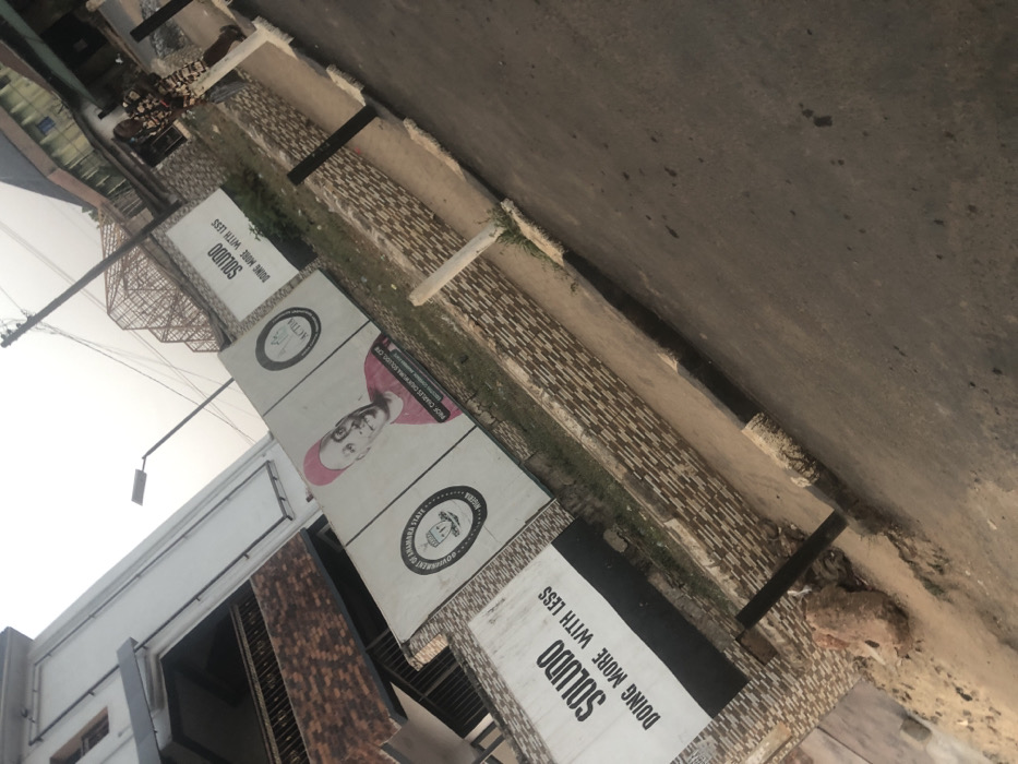 A street view displays a series of political posters or banners advertising "SOLUDO, DOING MORE WITH LESS." The banners feature a portrait of a man identified as "PROF CHARLES CHUKWUMA SOLIDO CRE," alongside the insignia of the "GOVERNMENT OF SAMARA STATE" and the logo of "ACTIA." The banners are mounted along a low brick wall bordering a street.