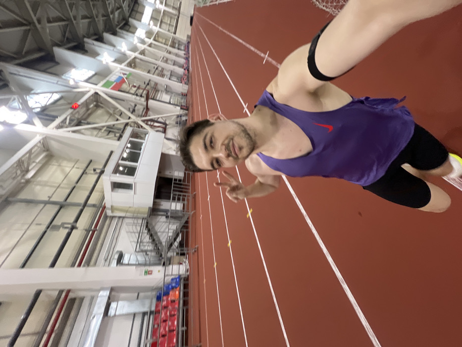 An adult male is captured in a selfie within an indoor athletic stadium, located in Tashevka, Russia