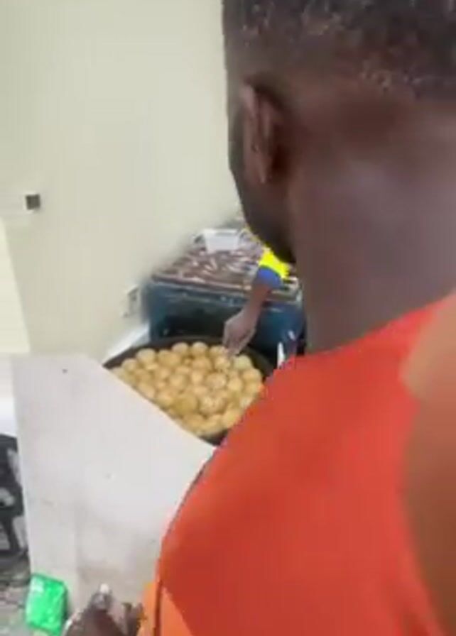 A man in a yellow and blue long-sleeved shirt and green and white patterned shorts is cooking or preparing food outdoors. He uses a utensil to transfer items that appear to be round balls into a large pan. The pan is next to a work surface with containers on it. Beside him, another man, partially visible, wears an orange shirt with a bird design. A rolling pin and a frying pan on a stool sit near the main cooking area. The environment appears to be an outdoor kitchen or food preparation area, with a light-colored wall behind the man cooking.