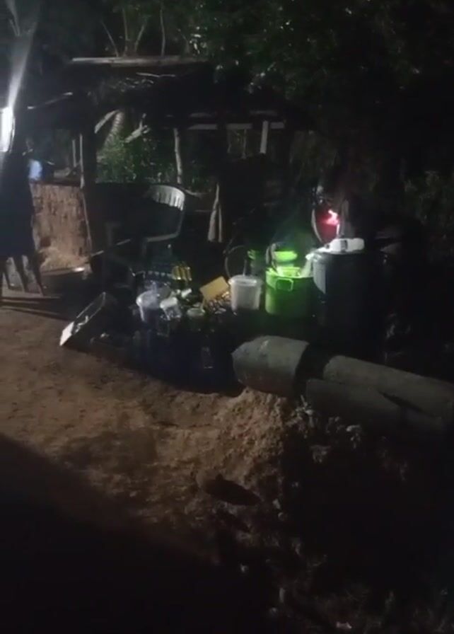 n outdoor gathering at night, likely a small party or cookout. The scene is dimly lit. There's a makeshift structure resembling a bar or serving area made of wood. In front of it, there's a collection of items, including plastic bottles, buckets, and what seems to be a cooler. There are also wooden logs on the ground. People can be seen standing around the bar area, though they are mostly silhouetted. Music is playing in the background. The ground appears to be sandy or dirt.