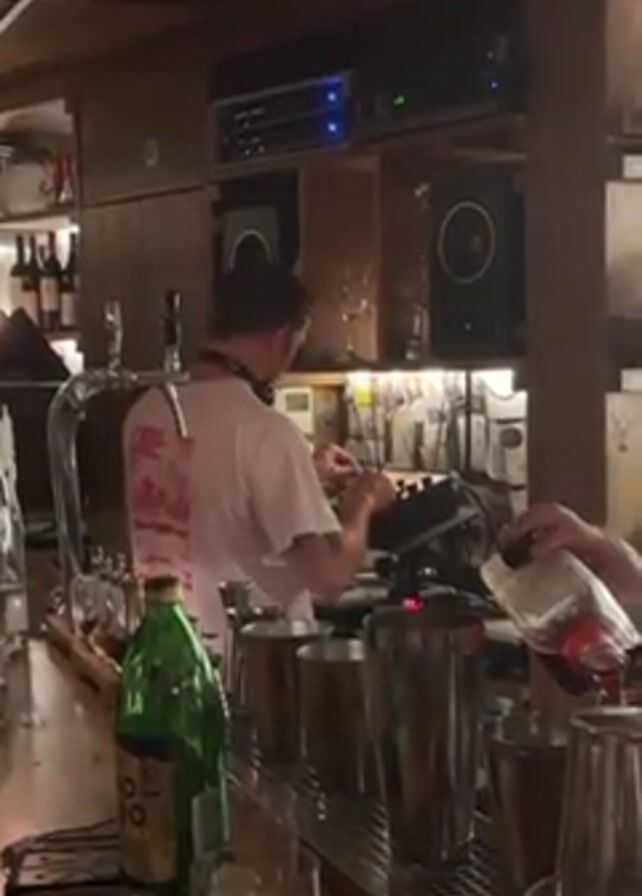 The interior of a bar is depicted in this shot. Two people are working behind the bar; one appears to be a DJ operating a DJ mixer and wearing headphones, while the other is pouring liquids, presumably making drinks. Glassware and cocktail shakers line the bar surface. Behind the DJ, speakers and shelves with various bottles are visible. The lighting is dim. The music is loud and danceable.
