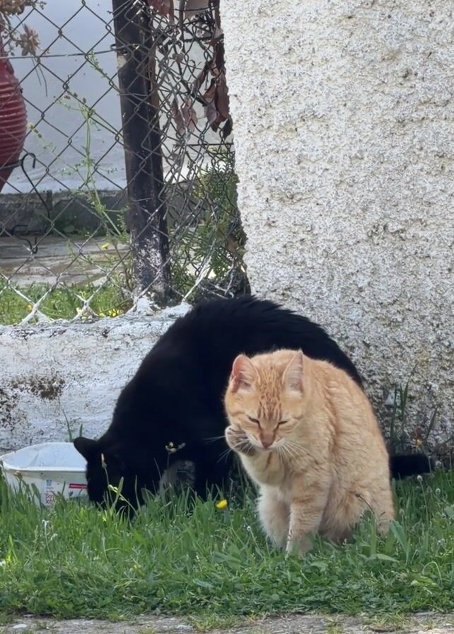 - "A medium, eye-level shot shows a black cat drinking from a white dish on the grass near a white wall and wire fence, while an orange tabby cat sits upright, licking its paw" by FM-IE2Ap1, licensed under CC BY 4.0