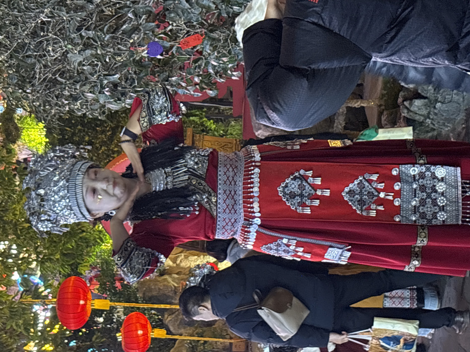 In an outdoor setting within Yuzhong District, China, a central figure is depicted wearing elaborate traditional ethnic attire
