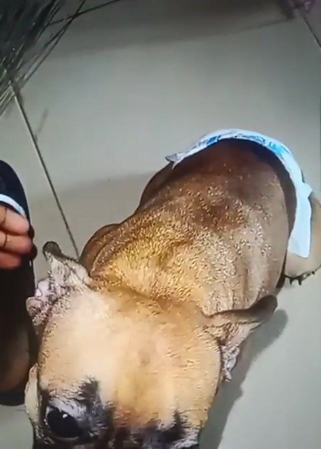 A tan dog with wrinkly skin wears a white diaper with a blue polka-dot pattern. The dog is standing on a light-colored tiled floor. A hand briefly touches the dog's back. A small plant-like object can be seen in the upper left of the frame.