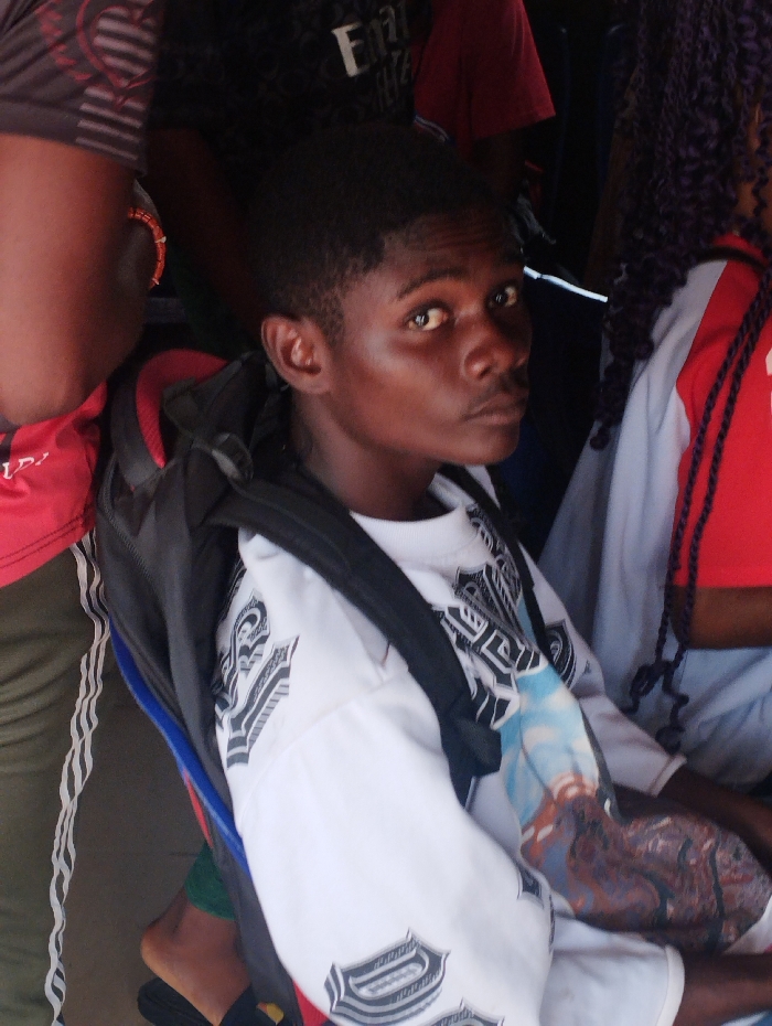An individual with dark skin and short dark hair is depicted seated in Ihiagwa, Nigeria, looking directly at the camera with a neutral expression