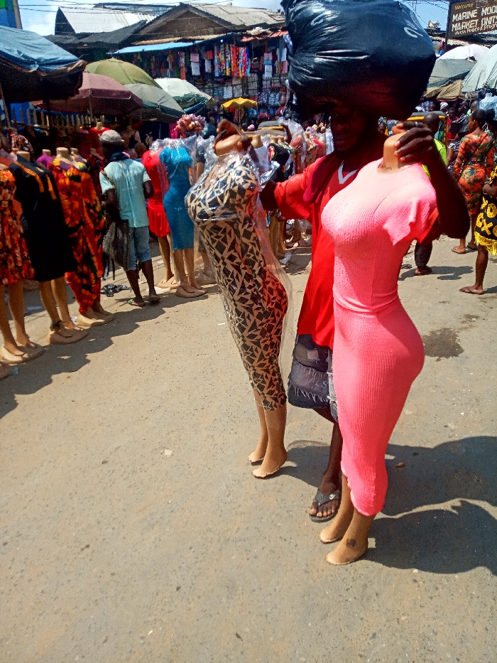The image depicts a bustling outdoor market street in Fegge, Nigeria. The scene is illuminated by strong daylight, casting defined shadows. In the foreground and center, a dark-skinned individual, likely male, wearing a red short-sleeved top and dark shorts, is actively transporting or displaying merchandise. A large black plastic bag is balanced on their head. The individual holds two female torso-and-leg mannequins by their upper sections. The mannequin in the individual's left hand (viewer's left) wears a form-fitting, sleeveless dress with a black and tan geometric pattern, encased in clear plastic. The mannequin in the individual's right hand wears a form-fitting, short-sleeved, ribbed pink dress with subtle embellishments, also encased in clear plastic. Both mannequins have bare, light-colored feet. To the left, a line of approximately ten female torso-and-leg mannequins are displayed along the edge of the paved road, dressed in various garments including black, orange-patterned, blue, and red dresses. Many of these mannequins are barefoot. Behind them, market stalls featuring blue and brown tarpaulin awnings are visible, with clothing items hanging for sale. A person in a light blue shirt is identifiable among the stalls. In the background on the right, further market activity is observed, including other individuals and additional clothing displays. A white sign with black lettering, partially visible on a building, reads "MARINE MOOD" and "MARKET FRONT...", indicating a specific market area. The ground consists of a light gray asphalt road with minimal debris.