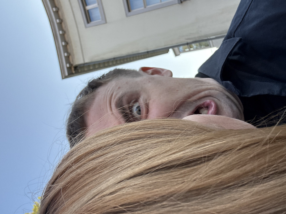 The image presents an extreme close-up, upward-angled shot of two individuals outdoors in Bruges, Belgium. The left foreground is dominated by a substantial mass of light brown hair, obscuring the face and body of one person. Partially visible to the right of this hair is the head and upper torso of a male individual. He exhibits an exaggerated facial expression characterized by a widely open left eye (viewer's right), a deeply furrowed brow, and an open mouth revealing upper and lower teeth, suggesting a scream, gasp, or comedic grimace. His facial skin shows pronounced wrinkles consistent with this contortion. He has short, dark hair and wears a dark-colored collared shirt. The background, largely visible on the right, consists of a clear, pale blue sky and a light-colored, multi-story building with a decorative cornice along its roofline and at least two visible windows.