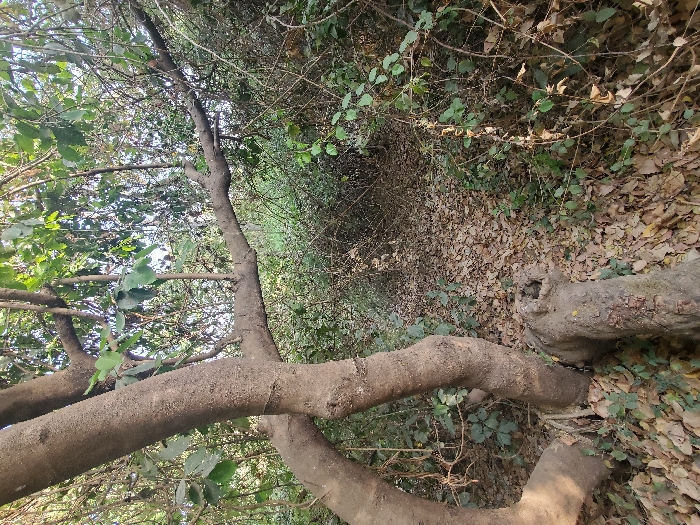 The image displays a natural, wooded environment in Mangu, Nigeria. In the left foreground, a large tree with light brown, textured bark stands prominently, featuring multiple gnarled trunks and roots at its base. A substantial branch extends horizontally from this tree across the mid-frame. The ground is densely covered with dry, fallen brown leaves, forming a discernible path or clearing that recedes into the background. This path is bordered by thick, untamed vegetation consisting of green and brown foliage, shrubs, and intertwined branches. The overhead canopy is also dense with leaves and branches, allowing dappled natural daylight to illuminate the scene. No individuals, animals, or man-made objects are visible within the frame.