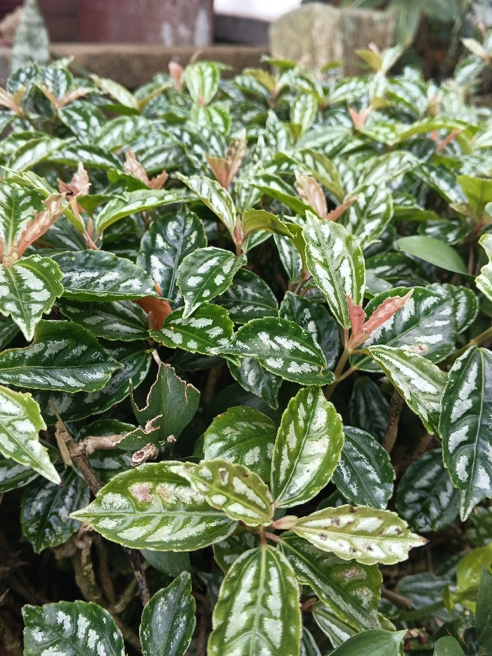 A lush ground cover of aluminum plants fills the frame. The dark green leaves feature striking silver markings. Emerging new growth displays reddish-brown stems and smaller leaves. Close inspection reveals some leaf damage. A blurred background shows a pot and a stone. The scene is brightly lit, showcasing the plant's unique texture and color contrast.