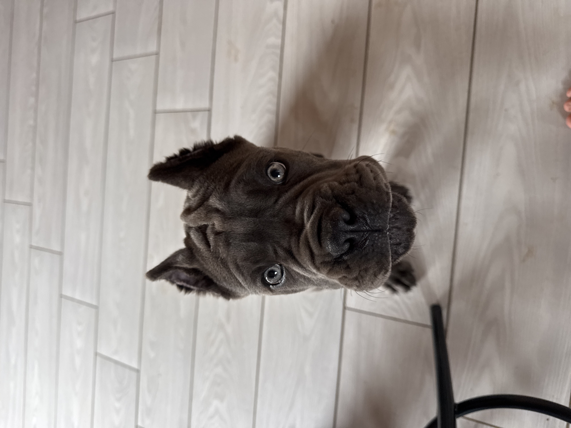 A gray dog with a wrinkled face looks up at the camera. The dog has short, cropped ears. Its eyes are wide and reflective. The dog is standing on a light-colored wooden floor. Part of a black chair leg is visible in the lower right corner of the image. A person's toes are visible in the upper right corner. The location is Unknown, Unknown.