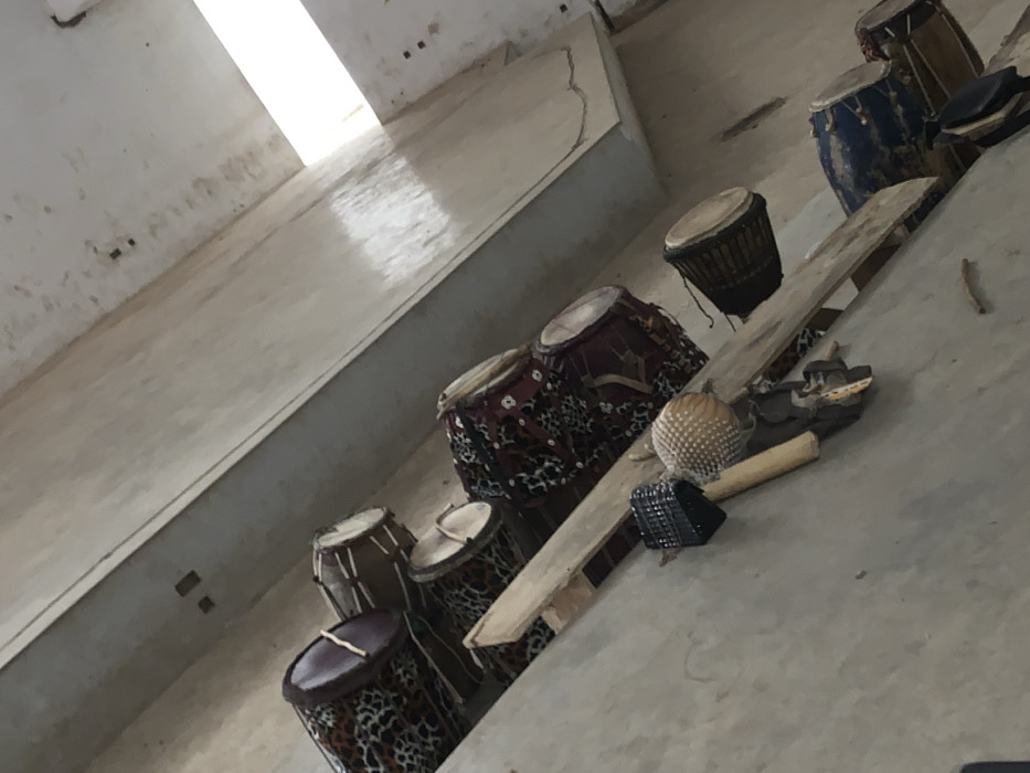 A collection of drums, varying in size and patterns, are haphazardly arranged on a pale, concrete floor and a slanted wooden plank. Some drums have animal print coverings, while others are plain. A white, dotted sphere rests near a dark, woven basket. Natural light streams in from a window, illuminating the otherwise muted tones of the empty space.