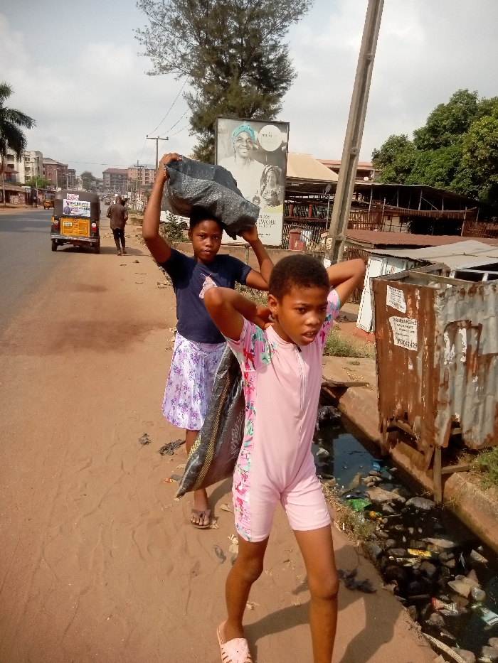 The image depicts an urban street scene in Nkpor, Nigeria, under daylight conditions. Two young individuals are positioned in the foreground on an unpaved, sandy-brown roadside adjacent to a paved road. The individual on the left, appearing to be a young female, wears a dark blue t-shirt and a white floral skirt. She carries a large, dark, possibly fabric-like bag balanced on her head. Her gaze is directed towards the camera. She wears open-toed sandals. The individual on the right, also appearing to be a young female, wears a pink, short-sleeved and short-legged jumpsuit with colorful patterns on the sides. She carries a dark bag draped over her left shoulder and has both hands clasped behind her head. Her mouth is slightly open, and her gaze is directed towards the camera. She wears light pink slip-on shoes. To their immediate right, a narrow, open drainage channel is visible, containing dark, stagnant water and various pieces of refuse, including plastic bottles and other debris. Further right are makeshift structures constructed from corrugated metal sheets. In the mid-ground, behind the individuals, a paved road stretches into the distance. A yellow and black motorized tricycle (often called "keke Napep") is parked on the left side of the road, and a lone male pedestrian walks away from the camera further down the road. Buildings of various heights and construction styles line both sides of the street. In the background, a large billboard displays images of people, including an older woman smiling, with text partially visible. A tall utility pole stands to the right of the billboard. Scattered trees and overhead power lines are also visible under a hazy sky.