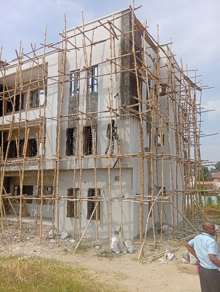 This image, taken in Okene, Nigeria, depicts a multi-story building under construction, observed from a low-angle perspective