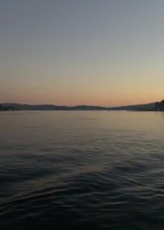body of water, probably a sea or a large lake, with small waves lapping across the surface. In the distance, there are silhouettes of land, possibly islands or a coastline. The sky is in shades of dusk, blending from a pale grey-blue above to an orange-yellow horizon. There is little visible movement besides the gentle waves.