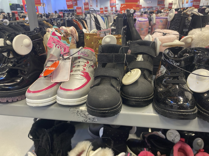 A shelf displays children's shoes, each with a security tag. On the left are black patent leather boots with laces. Next to them are silver and pink sneakers with an LOL Surprise tag. A pair of black velcro boots are in the center. On the right, there are black glittery boots featuring Disney's Frozen. Additional shoes are visible on the shelf below, featuring fur lining and various colors. Clothes racks are in the background.