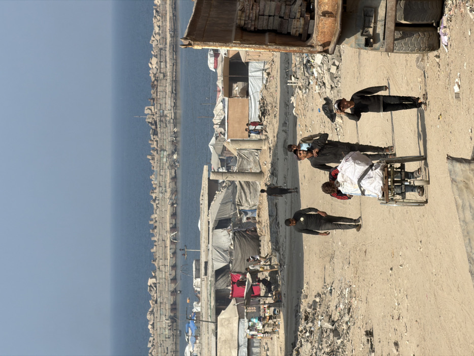The image depicts a crowded coastal area in an unspecified location within Gaza, characterized by makeshift structures, debris, and human activity under a clear sky. In the foreground, an unpaved, dusty dirt path strewn with rubble and debris leads into the scene. On the far right, the rear portion of a rusty, light brown industrial truck is visible, with its large tire and a portion of its bed loaded with bricks or similar material. In the midground, several individuals are present on the path. A person, whose back is to the viewer, is seated in a manual wheelchair that carries a large, white, bundled object secured with dark straps. Another individual in a dark long-sleeved shirt and dark pants is pushing the wheelchair. To their immediate left, a man in a dark long-sleeved shirt and dark pants walks forward. To the right of the wheelchair, a young boy in a dark long-sleeved shirt, dark pants, and sandals stands facing the viewer, his right hand raised to his forehead as if shielding his eyes. Behind him, another man in a dark shirt and light pants walks towards the viewer. Further back, on the left, several other figures are visible walking on the path. The background reveals a densely packed informal settlement situated close to the sea. This area is characterized by numerous makeshift dwellings, tents, and shelters constructed from tarpaulins, corrugated metal, and various salvaged materials. Debris and rubble are scattered throughout this settlement. Two prominent, weathered cylindrical stone columns, possibly ancient or decorative, stand upright amidst the temporary structures. Further into the settlement, more individuals, including children, are visible among the dwellings. On the far left, a small market stall or vendor setup is discernible. Beyond the settlement, a large body of deep blue water, likely the Mediterranean Sea, extends to the horizon under a light blue sky. A robust breakwater or sea wall, composed of numerous large concrete blocks (including tetrapods and rectangular units), runs horizontally across the water, forming a protective barrier for a calmer inlet or harbor area.