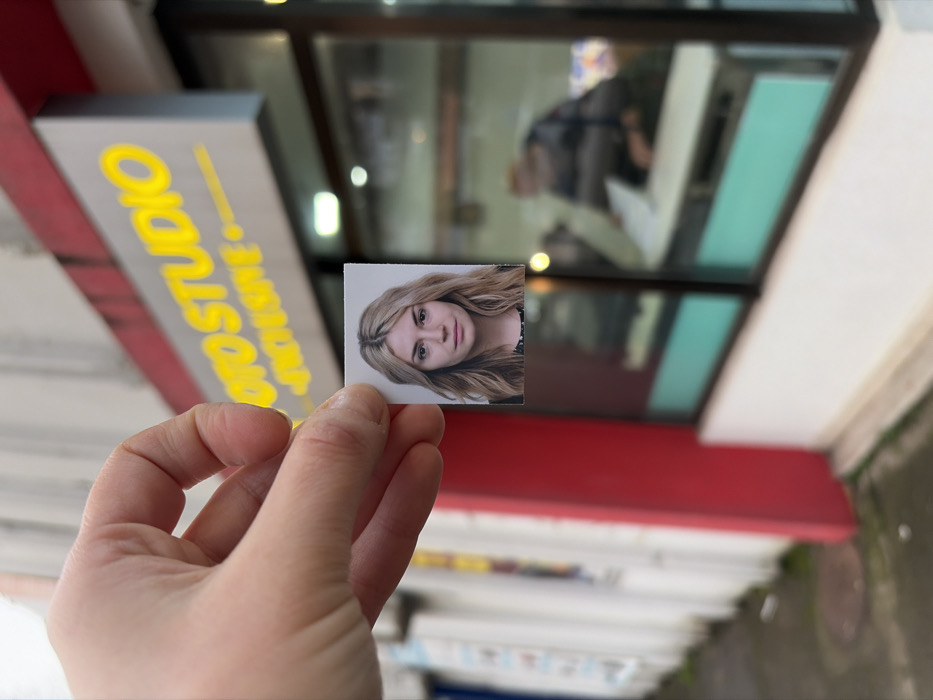 A person's hand holds a small photo of a woman with blonde hair, posing in front of what seems to be a photo studio. The studio's sign, partially visible with bright yellow lettering, reads "PHOTO STUDIO". Behind the photo, a red beam is visible, and above it, there are window panels that reflect a blurry image of a person indoors. The scene suggests the photo is being held up in front of the studio where it might have been taken.
