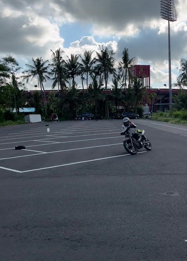 A person wearing a helmet and riding a black motorcycle performs a stunt in a parking lot. The rider maneuvers the motorcycle in tight circles, tilting the bike sharply. The parking lot is lined with white parking space markers. Palm trees and buildings are visible in the background under a partly cloudy sky. The rider moves around a small black tire and a small white object placed on the parking lot surface.