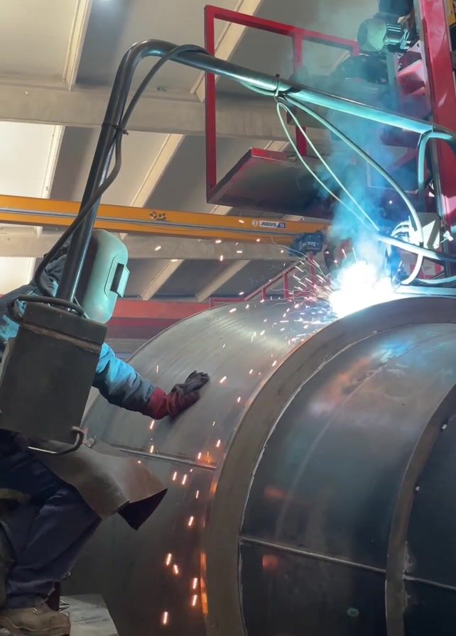 A person in a welding mask is welding a large, cylindrical metal structure inside an industrial building